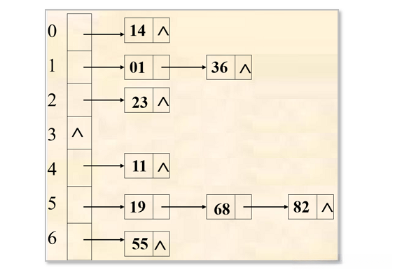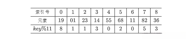 例如:关键字序列{19,01,23,14,55,68,11,82,36},哈希函数设为 H(key) = key MOD 7