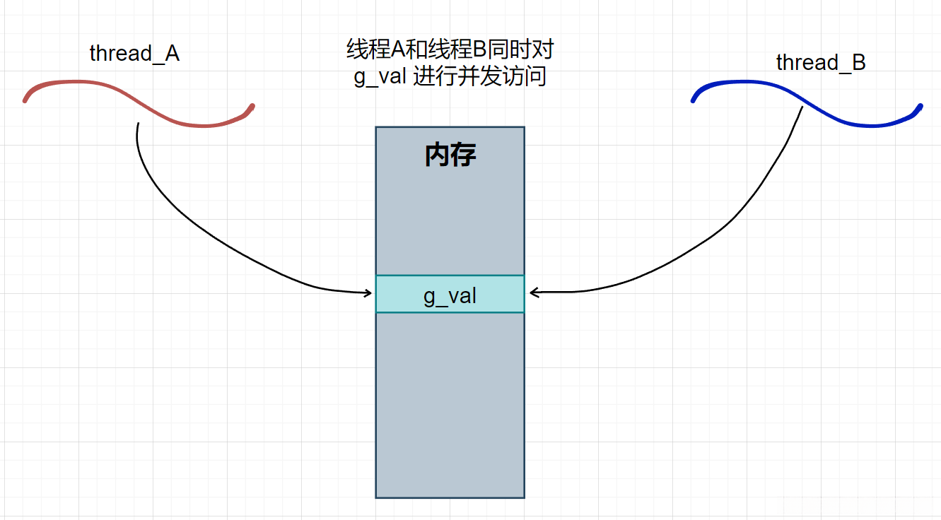 例如存在一个全局变量对象 g_val 以及两个独立的线程实例 thread_A 和 thread_B,这两个线程实例同时持续不断地对 g_val 执行自减操作。