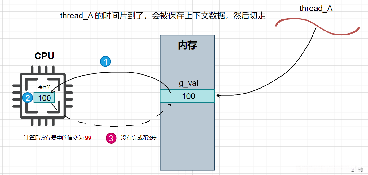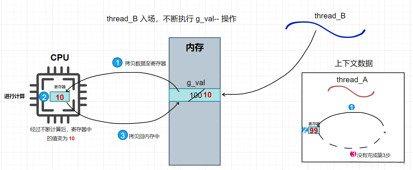 在 thread_A 的第三步尚未完成的情况下,在内存单元格 g_val 未被修改之前(尽管 thread_A 错误地认为自己已完成第二阶段的操作),在操作系统进行线程调度的过程中,在其所在的线程执行环境及其相关数据将被保留下来的状态下,在一旦 thread_A 被剥夺资源使用权后,在另一个线程 thread_B 将会立即被调入执行相应的操作以继续执行 g_val-- 操作的过程中