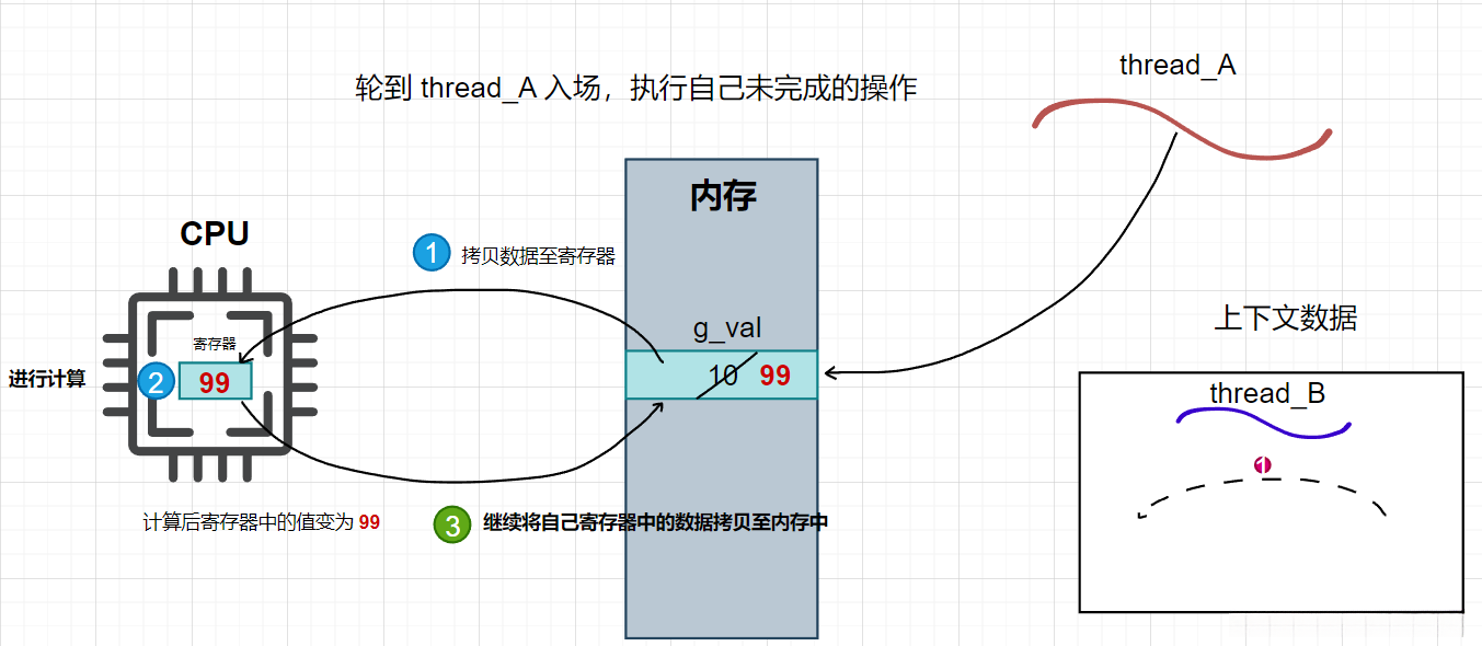 当 thread_B 将变量 g_val 更改为数值 10 时(随后),该事件被操作系统打断了(接着由线程A重新开始处理)。在此期间(或在此时),线程A将利用自己的先前状态(即其之前的未完成任务)继续执行其后续操作(即完成第三步操作)。值得注意的是,在此过程中(或期间),变量 g\_val 的原始上下文信息也会得以保存。