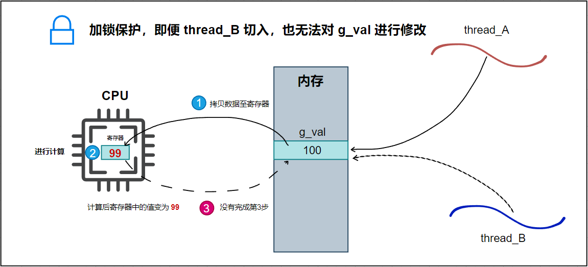 在进入临界区之前进行锁操作,在退出临界区后释放锁。这样做的目的是为了确保在并发访问 临界资源 时的操作严格按顺序执行。例如,在这种机制下,当 thread_A 和 thread_B 同时试图对 g_val 进行操作时(即并发访问),如果对资源进行了 锁操作,则当 thread_A 被剥夺对该资源的控制后(即被切走),thread_B 就无法对 g_val 进行任何操作。这是因为此时 lock 已经被 thread_A 持有,在没有获得 exclusive lock 的情况下其他线程必须等待(即阻塞)直到 thread_A 完成其 lock 的释放过程(这意味着该 exclusive lock 操作已经完成)。