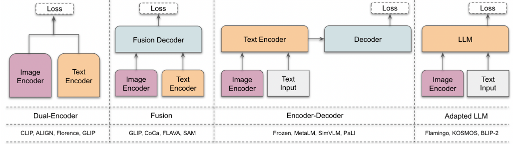 双模态编码架构中主要包含多个独立模块分别负责识别或解析视觉信息与文本内容,并通过优化函数对输出结果进行进一步处理。
