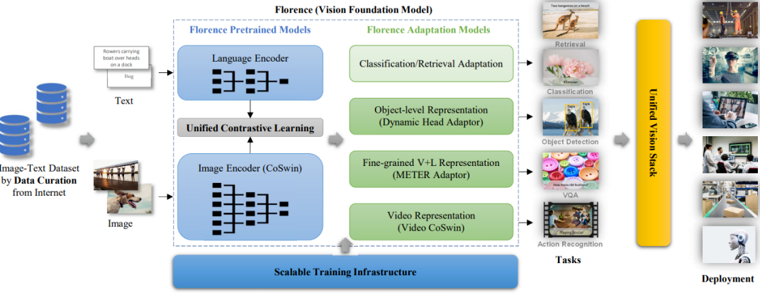 Florence基于clip样式进行预训练,并发展出包含三个不同适配头的架构,该架构能够支持多模态的数据在时间维度和空间维度上的多样化处理。