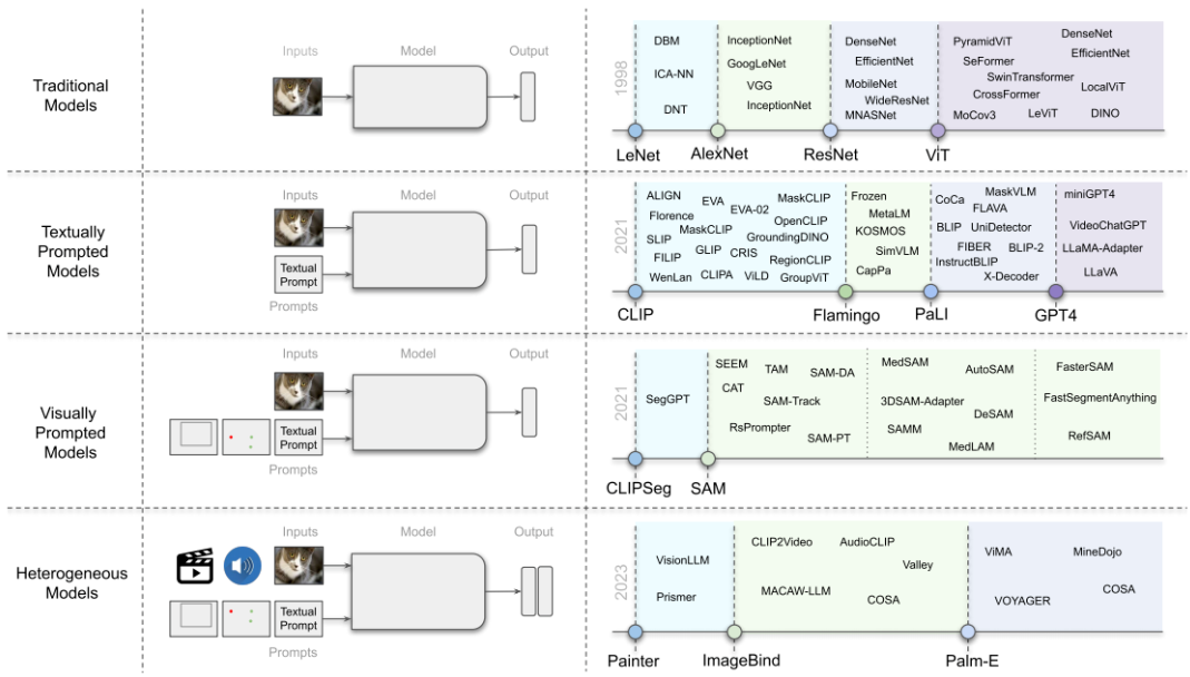 视觉大模型近期涌现了许多优秀的工作!这些研究主要集中在多模态学习上,通过结合图像和文本模态来提升模型性能。基础架构方面,许多模型采用了双编码器或融合架构来处理视觉与语言之间的关联。目标函数上,则主要采用对比学习和生成式学习方法来优化多模态对齐效果。预训练过程中利用了大规模图像-文本数据集、伪标签数据以及组合数据集来增强模型的通用性。微调阶段则通过提升特定任务性能(如视觉定位)或指导下游任务(如视觉问答)来进一步优化模型。提示工程也被用来辅助处理大规模多模态对齐问题。总体而言,这些工作为多模态视觉语言模型的发展提供了丰富的思路和技术支持!