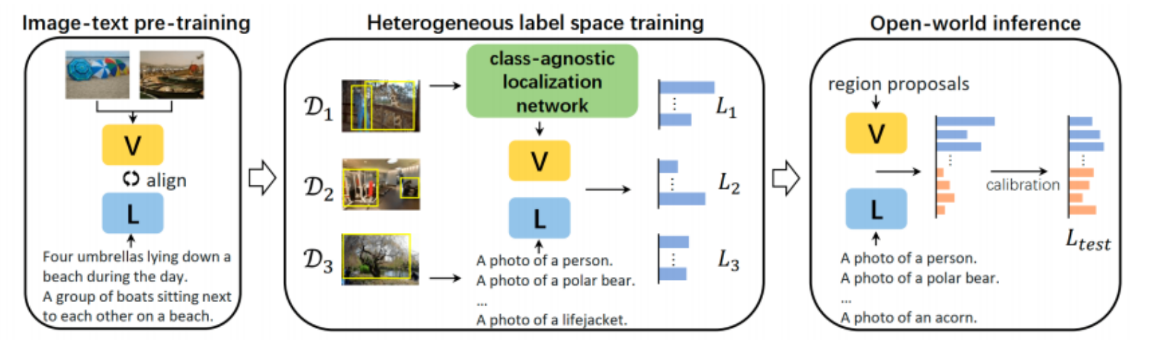 UniDetector: 该系统的目标是实现通用物体检测,在开放世界环境中识别 novel 类别实例。其采用了包含三个阶段的学习架构:首先是基于与 RegionCLIP 类似的预训练策略进行模型初始化;其次是利用异构数据集进行强化学习;最后通过概率校准技术提升 novel 类别的检测精度。该系统在支持大规模类群的同时实现了对封闭场景物体检测的高度准确率。
