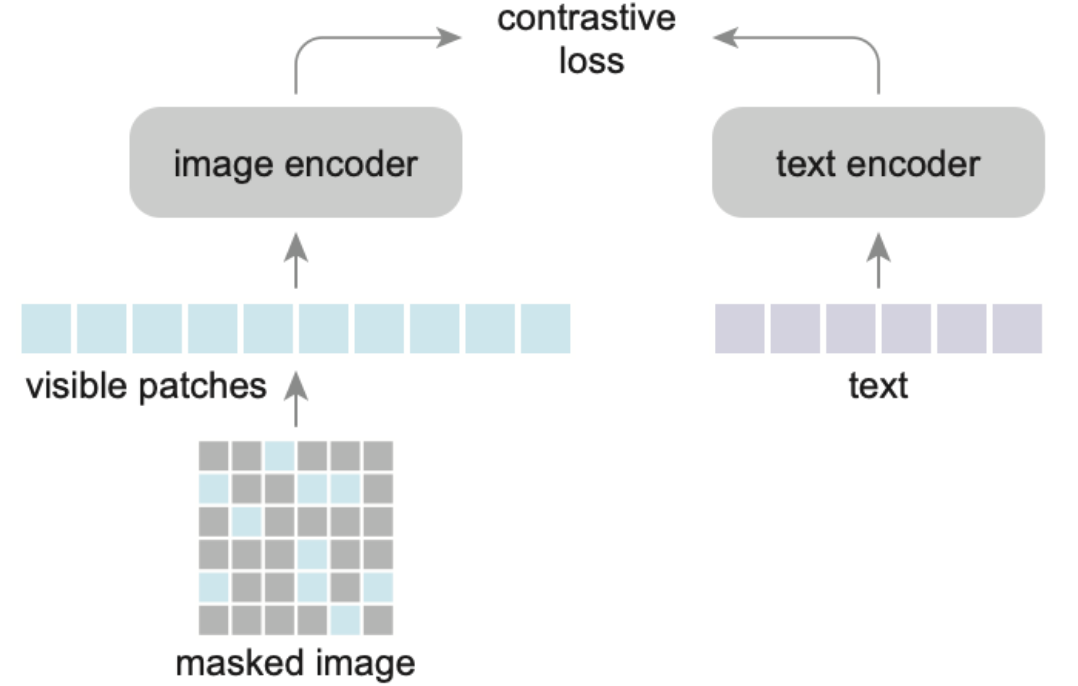FLIP 是一种更为高效且简洁的训练 CLIP 方法。相比传统方法而言,其基本原理较为直观。该方法借鉴自MAE模型的思想,在CLIP框架中引入了Mask机制。具体而言,在重建过程中并未考虑被遮蔽的部分。值得注意的是,在CLIP模型中同样对文本信息也采取了类似的处理策略——即直接丢弃不可见的信息内容——这种处理方式与BERT模型存在显著差异。然而,在具体实现上有所不同:BERT则是通过替换mask token的方式来处理不可见的信息(即不执行任何重建工作),而这里则直接舍弃不可见部分以降低计算复杂度和资源消耗量)。这种方法能够有效降低文本编码所需资源。