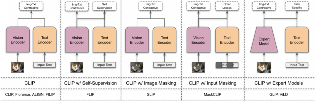 就整体而言,在这一系列基础性的视觉研究工作中,这些方法旨在通过对比学习与遮蔽学习等技术手段来优化 clip 的性能。