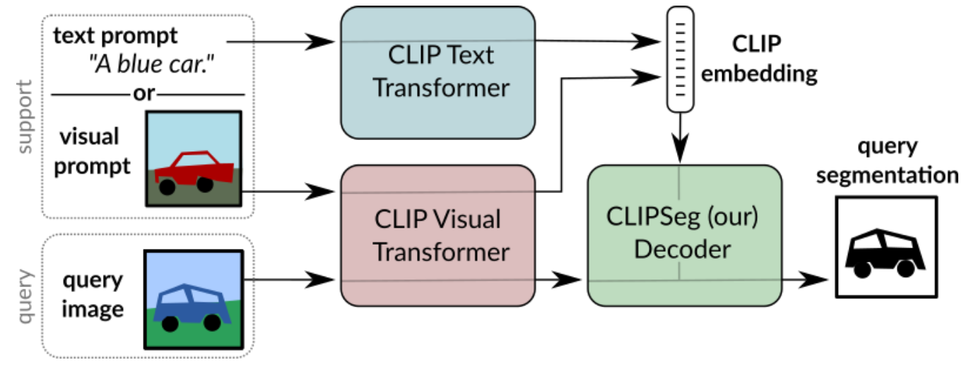 CLIPSeg通过支持视觉和文本查询的功能来提取相应的clip编码器生成的嵌入,并将其整合到clipseg解码器中。