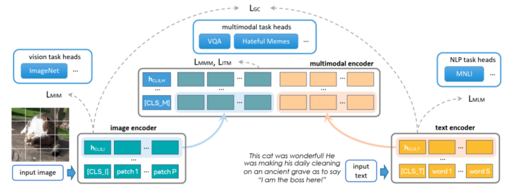 FLAVA:该模型既能处理单一模式任务又能适应多种模式结合的情况,在经过多组不同的损失函数优化后,在视觉识别、语言理解以及视觉与语言融合的任务中展现出优异的效果。