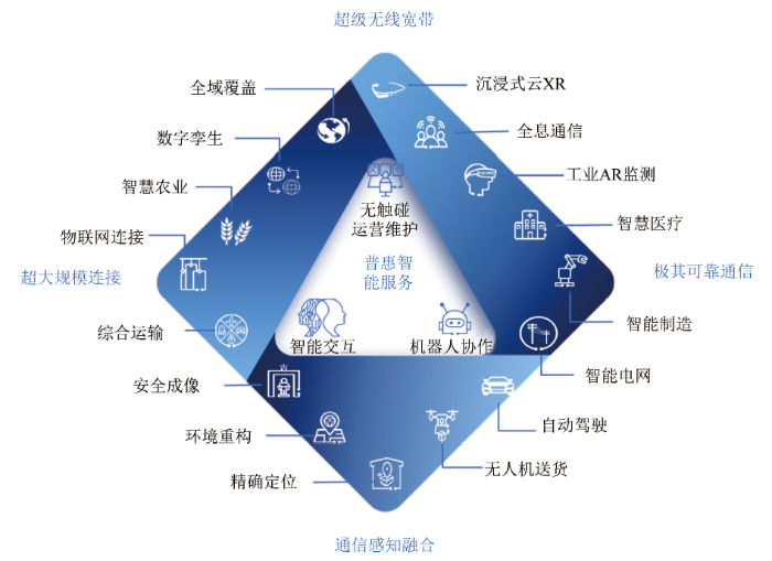 面向2030年及未来,在社会宏观发展进步、经济高质量提升以及环境可持续发展等因素的共同驱动下,人类社会将进入智能化时代,全新的场景及应用需求将极大拓展移动通信网络服务的能力边界,6G将有效服务智能化生产与生活,助力构建智能普惠的人类社会。6G将与人工智能、大数据、云计算等新一代网络信息技术加速融合;将充分利用低中高全频谱资源,满足不同场景及业务应用需求;将实现空天地一体化的全球无缝立体覆盖,随时随地满足安全可靠的“人机物”无限连接需求。6G将为沉浸式云XR、全息通信、感官互联、智慧交互、通信感知、普惠智能、数字孪生、全域覆盖、精密机器控制等5G网络难以实现的全新业务应用提供能力支撑,助力实现真实环境中物理实体的数字化和智能化,并渗透至生产生活及社会治理的方方面面,实现世间万物“万物智联、数字孪生”的总体愿景[1]。