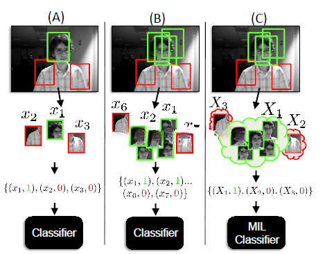 在传统的判别式学习算法中,我们训练分类器的话,需要正负样本的集合,在这里就是从一个图像patch提取的特征。而在MIL中,形式如下: