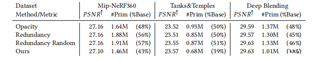 • 一种高效且具有分辨率意识的基元修剪方案,在优化过程中能够去除多余的数据点,并使该方案所对应的基元计数总数降低约60%。