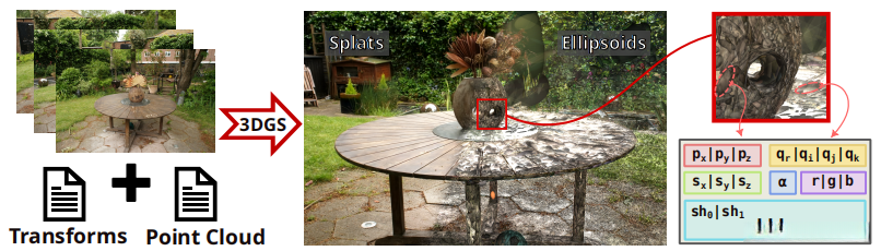3DGS将场景建模为一组3D高斯基元(我们将其表示为椭球体),见图2右端所示。这些基元均以指定点为中心,并各自携带一组属性参数:用于alpha混合的透光率(即各向异性比例和旋转参数),以及表示漫反射方向辐射的球面谐波(SH)。该技术通常通过相机校准算法生成的点云来进行初始化操作。然而,在新颖视图合成过程中所使用的初始点云过于稀疏;因此引入了3DGS优化方法——一种基于自适应控制的高斯数目调节策略。在初始阶段为空或缺乏细节的区域,则通过动态增加基元数量来实现密集化处理。为了实现密集化效果,在基元位置密度较大的区域会优先增加基元数量;同时为了保证渲染效率,在低透光率的基本体或占据世界空间范围较大的基本体会定期进行移除处理。