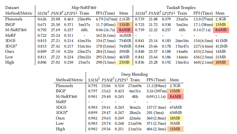 我们将我们提出的方法与以前的解决方案进行了比较。在表2中,我们复制了原始3DGS论文的结果,并添加了四行:一行用于最近发布的MeRF方法,一行用于3DGS*,对应于使用公共代码库的运行(见前面的脚注)和我们的完整解决方案,以及低压缩和高压缩变体。我们展示了30K训练迭代后基于3DGS的方法的结果。为了说明不同目标用例的可能权衡,我们还包括两种配置略有不同的变体,实现了不同程度的压缩:“低”和“高”。这些变体使用参数𝜖õ=0.01,𝜖𝑐𝑑𝑖𝑠𝑡 = 0.0068和,𝜖𝑐𝑑𝑖𝑠𝑡 = 分别为0.054。此外,对于高压缩变体,要考虑用于剔除的最小冗余分数被设置为2。我们看到,与INGP甚至MipNerf360相比,我们提出的方法及其变体在内存方面具有竞争力,但保持了3DGS w.r.t.速度和质量的优势,包括训练时间。