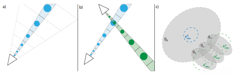 图4展示了我们提出的基于分辨率和尺度感知冗余度量在高斯表示场景必要性分析中的应用效果。a)各个相机能够捕获特定分辨率的细节信息,在相机距离场景越远的情况下,则该相机所代表的空间分辨率会相应降低;b)在同一个场景中,默认情况下由多个摄影机组成的基元能够分别表示不同的空间分辨率层次;c)对于每个高斯g,在输入条件下我们选取最高分辨率a_{i min}来覆盖该区域;在此基础上统计区域内与该高斯覆盖范围相交的所有高斯个体的数量;随后通过设置阈值K剔除那些受到K个及以上其他高斯影响区域内的高斯个体;在这个过程中发现,在实际应用中并非所有高斯都能被有效剔除——例如对于高斯g0而言,在其覆盖区域内至少存在一个子区域a_{0 min}并未受到其他任何高斯的影响。