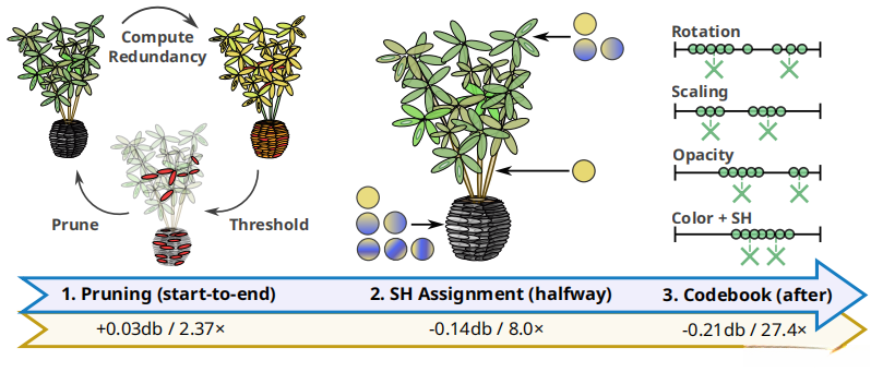 在分析的基础上, 我们首先开发了一种能够识别冗余基元并将其在优化过程中进行修剪的方法. 随后, 我们引入了一种允许可变数量, 每个基元对应的SH频带. 最后, 针对那些对高精度要求不高的属性, 我们执行了量化处理, 作为后处理步骤进行了码本压缩.