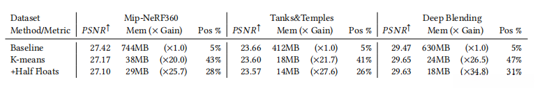 表4中展示了半精度浮点对总模型内存的PSNR、内存和位置内存占用率的影响。该方法使质量下降限制降低至约0.07 dB,并实现了内存减少至少20%的目标。
