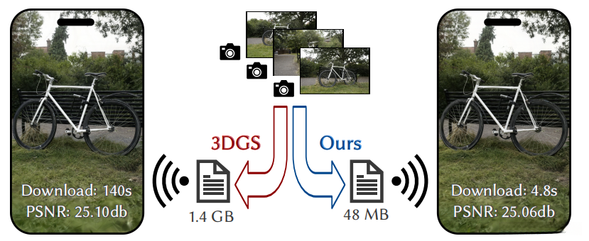 该方法使得内存占用降低了27倍。在流媒体设置中展示了实验结果,并采用WebGL技术实现了渲染过程。与现有方案相比,在速度方面提升了约1.7倍,在压缩效率方面提升了约1.8倍的同时内存消耗也大幅降低。我们是首个适用于流媒体及移动平台的3DGS解决方案,在视觉质量方面表现优异。通过对比实验发现,在速度、压缩效率及内存占用这三个关键指标上均优于现有方案。