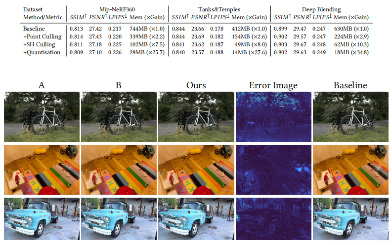如表1所示,我们展示了该方法的有效性。通过原始减少技术(即原方法二)的应用,在内存占用上实现了降低至其32%-52%区间的目标效果。在PSNR指标方面的影响最小值为-0.32dB至+0.16dB,在视觉质量方面的影响最小。同时观察到最低程度的视觉质量退化现象,并且在某些情况下实现了改进效果(即原方法与SH剔除结合同样可作为正则化手段),这表明优化过程能够寻找到更好的泛化能力解。具体而言,在该研究中我们成功证明了三个主要贡献:一是原方法与SH剔除技术相结合的应用;二是量化优化策略的确立;三是每个关键组件均能将数据规模缩减至原来的三分之一水平(即每个关键组件均能实现约三倍的数据规模缩减)。通过证明原方法与SH剔除技术相结合以及量化优化策略的应用(即量化处理后的数据量较之未采用量化处理的情况减少了约三倍),我们成功实现了所有目标数据集所占存储空间总量平均缩减约二十七倍的效果)。此外,在具体实现过程中发现:若将代码簿与半浮点数据整合进渲染引擎中,则能够在不增加额外存储开销的前提下显著提升VRAM消耗效率(即此方案能够在满足所需存储条件下最大限度地降低VRAM消耗)。