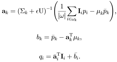 I指引导图像,Q是输出图像,ak和bk两个系数根据引导图I和输入图像P共同决定。将上式两边求梯度,可以得到▽q=a*▽I,即输出图像的梯度信息完全由引导图像的梯度信息决定,当引导图中有边界时,输出图像中对应位置也会有边界。而a和b的值将会决定梯度信息和平滑信息的权重大小。