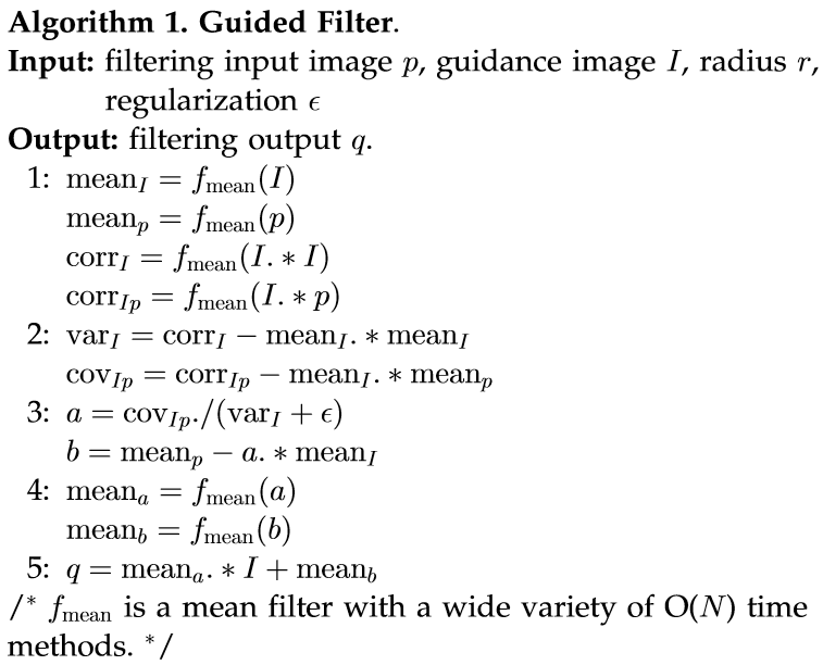 根据原文献中提供的伪代码,不难用C++实现引导图滤波算法。伪代码如下: