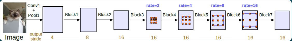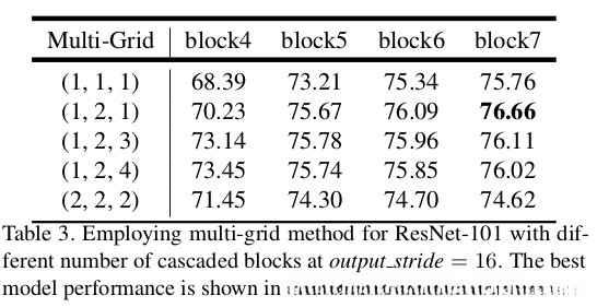 这个就是对一个block中的三个卷积进行rate的设置,按照一般不加空洞卷积的就是(1, 1, 1),加上空洞卷积的,不进行这种rate设置的,我们就是默认从第一个block开始是(2, 2, 2),后面的block一直double,如(4, 4, 4)。这里就是所有block全部用Multi-Grid里设置的值。