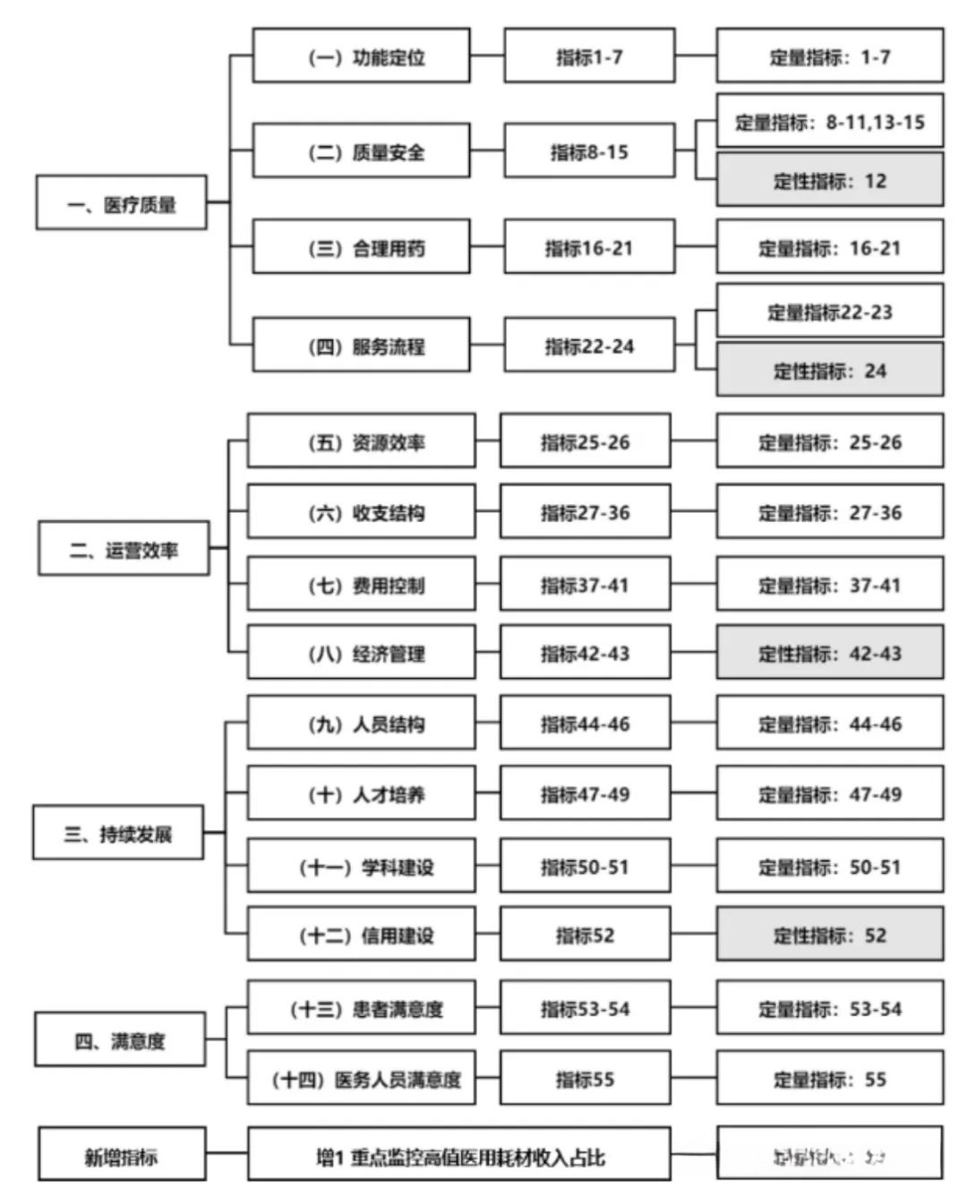 涵盖医疗质量、运营效率、持续发展以及满意度评价四大类共计55个指标。通过绩效考核机制的推行,在三级公立医院中推动管理模式从粗放型向全方位转变,并旨在实现效率与质量的全面提升。