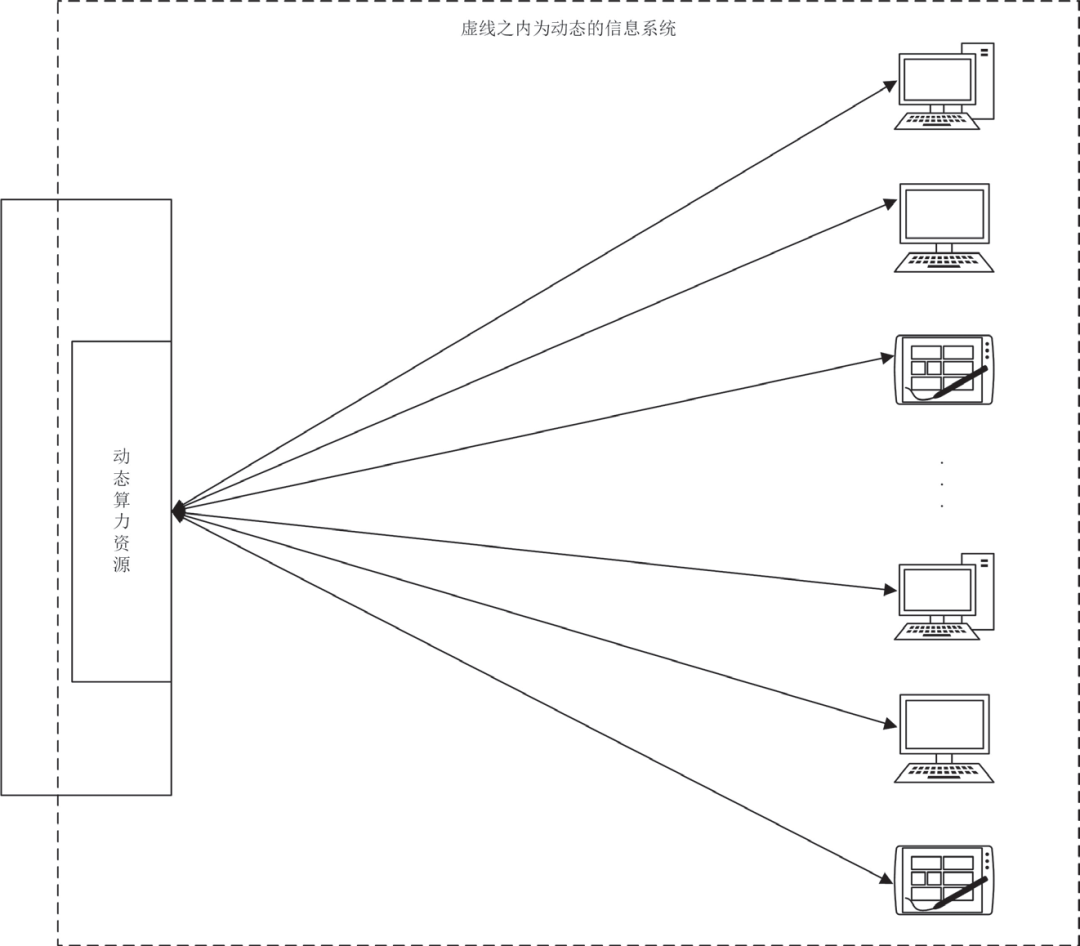 由云平台提供的计算能力与关联的一组租户及其被赋予的权利持有者配上相应的硬件配置及配套设施(其中包含网络基础设施),形成了一个自给自足且能够实时响应需求的信息架构。
