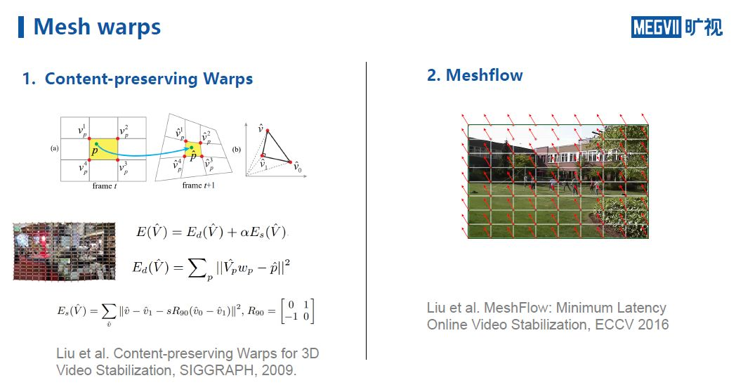 MeshFlow其实属于Mesh Warps这套算法中的一个。Mesh Warps在计算机视觉顶会中每年都能看到相关工作,其中一个比较经典的算法是Content-preserving Warps,如下图左边所示: