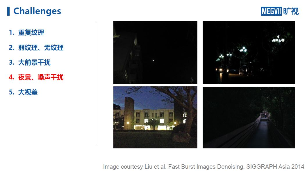 第四,夜景、噪声干扰。 与无纹理情况类似,这类情况也会对特征点的检测提出挑战,在夜景、噪声干扰下,系统往往只能在一小块区域检测出特征点,然而用一小块区域来对齐整张图像,效果往往不尽如人意。