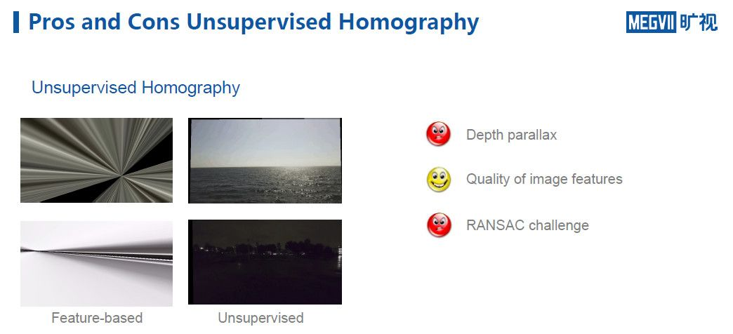 到目前为止,我们介绍了监督式和无监督式的Deep Homography方法,总结其特点发现,在面对前面Homography遭遇的3大困难时,这两种深度学习方法虽然解决不了深度视差的问题与RANSAC问题,但它们对图像特征的表达比较鲁棒,不像传统方法很依赖特征点。