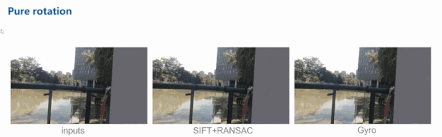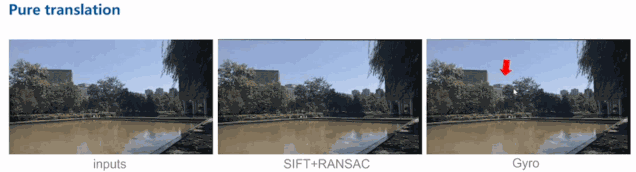 可以发现,根据gyro数据可以很好对齐相机纯旋转(图中相机架设在一个脚架上旋转拍摄)拍摄的画面;而在当做translation的时候,仅用陀螺的数据就无法精确对齐画面了。不过值得注意的是,真实运动中大部分运动都来自于旋转。