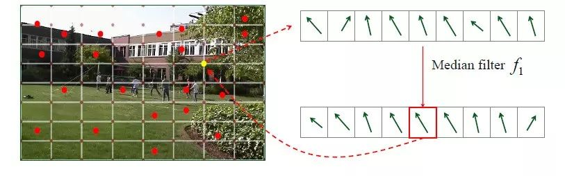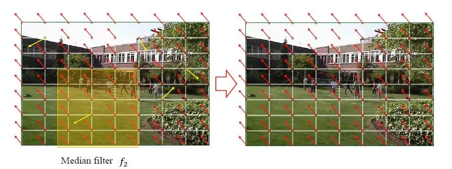 当为每一个vertex分配了运动信息以后,由于这些信息可能存在误差(not specially smooth),如下图黄色箭头所示方向,因此会再做一次 specially 的中值滤波,得到一个specially smooth的运动场。