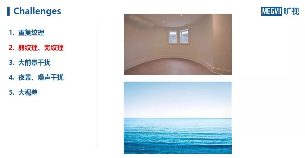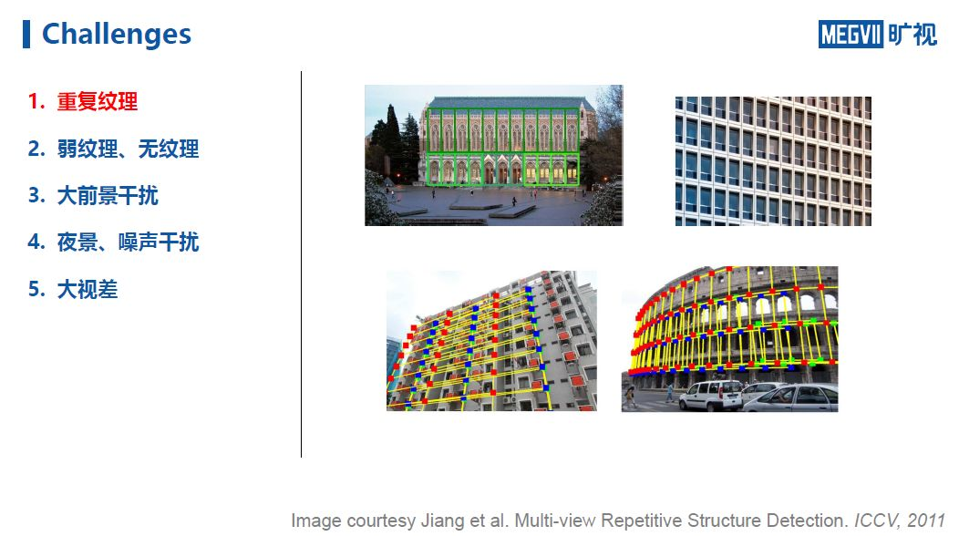 第一,重复纹理。 对于有重复纹理的场景(比如很多建筑的窗户非常类似),系统可能检测出很多特征点,但进行匹配时却不能有效一一对应。