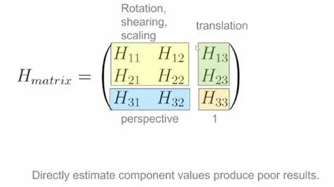 其中由于使用的是齐次坐标系,所以h_22一般等于1,即该矩阵只有8个自由度,又因为估算8个自由度需要4对匹配点,一对匹配点提供2约束,因此会有8个方程。