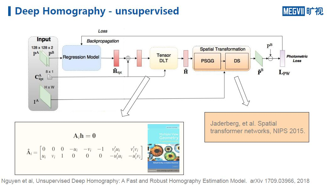 之后,我们用这个Homography来对图像做一个warping操作(变形),得到图像PA变形以后的图像,然后再用它与原来的PB计算Photometric Loss,然后回传进行训练。通过这样的方式就不需要使用监督label。