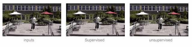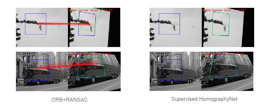 上图为监督式和无监督式Deep Homography方法的效果对比,可以看见,无监督方法在对齐非人工合成的图像时候更加鲁棒。