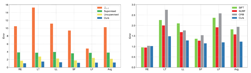 有趣的是,右图中我们使用了传统的一些基于特征点的方法来做对比,可以发现,在Regular类数据中,大家相差无几,甚至传统方法还比我们的方法稍强。这说明假设图像纹理足够丰富,且是一个homography可以描述的场景,那么传统方法的性能非常强大。