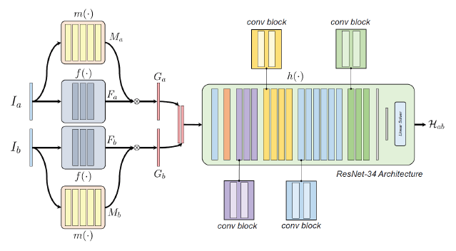 首先,我们的工作也是一个无监督方法,与前述无监督方法不同的是,会多估算一个mask。如下图,当输入两张图以后,在提取特征的同时,也估算一个mask;进一步,用特征乘上mask,把结果交给homography估计器。在我们方法中,最核心的部分就是这个mask,该mask类似于RANSAC的功能,可类比为一个NN RANSAC。