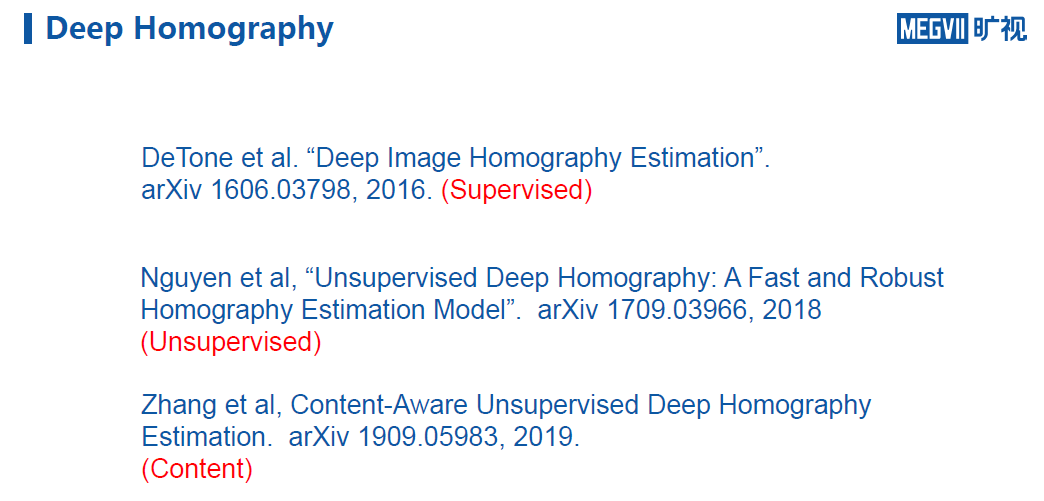 关于Deep Homography的相关文献并不多,经典文献有下图给出的2016、2018年两个工作,第3篇是旷视成都研究院今年的工作。根据这些方法的特性,可以将其划分为监督式、非监督式和基于内容的非监督式方法。