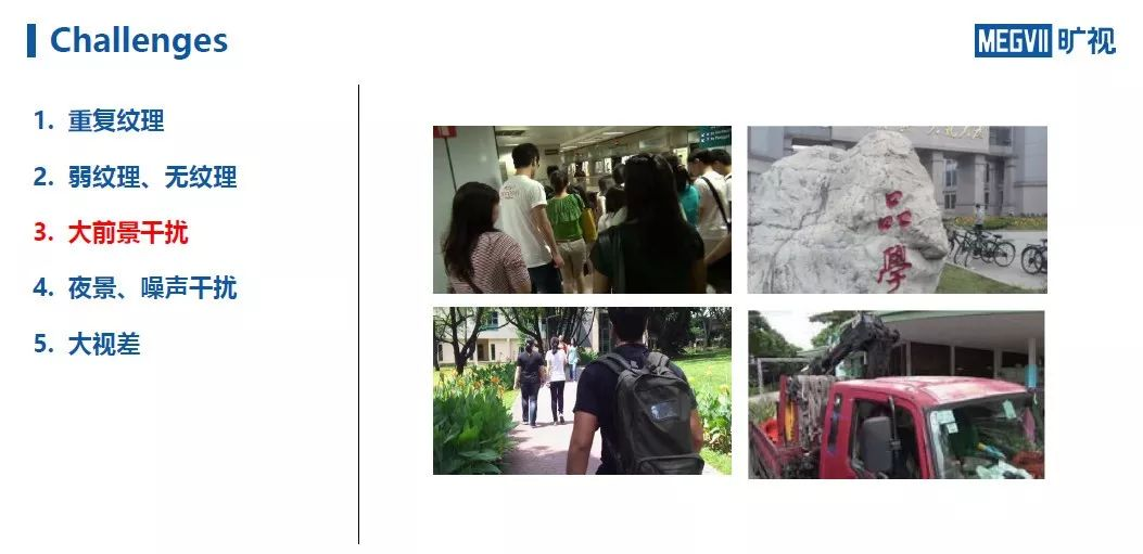 第三,大前景干扰。 当图像中出现大前景干扰时(无论是动态还是静态干扰),都会对系统的鲁棒性造成很大挑战,因为这种情况下当画面视角稍加变化,受遮挡影响,画面中可能就会出现从未见过的新场景。