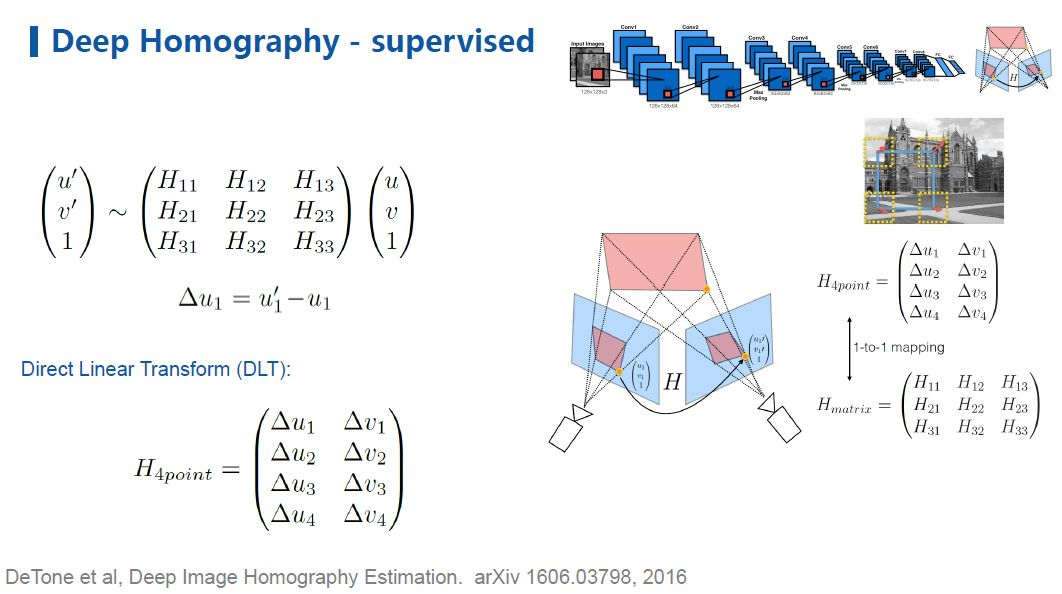 不过值得提醒的是,如果直接回归Homography中那8个参数其实并不好,因为如下图所示,不同参数表示的内容不同,即这些参数有着不同的量纲,如果直接回归,网络较难训练,即便对Homography做normalization,训练也比较困难。