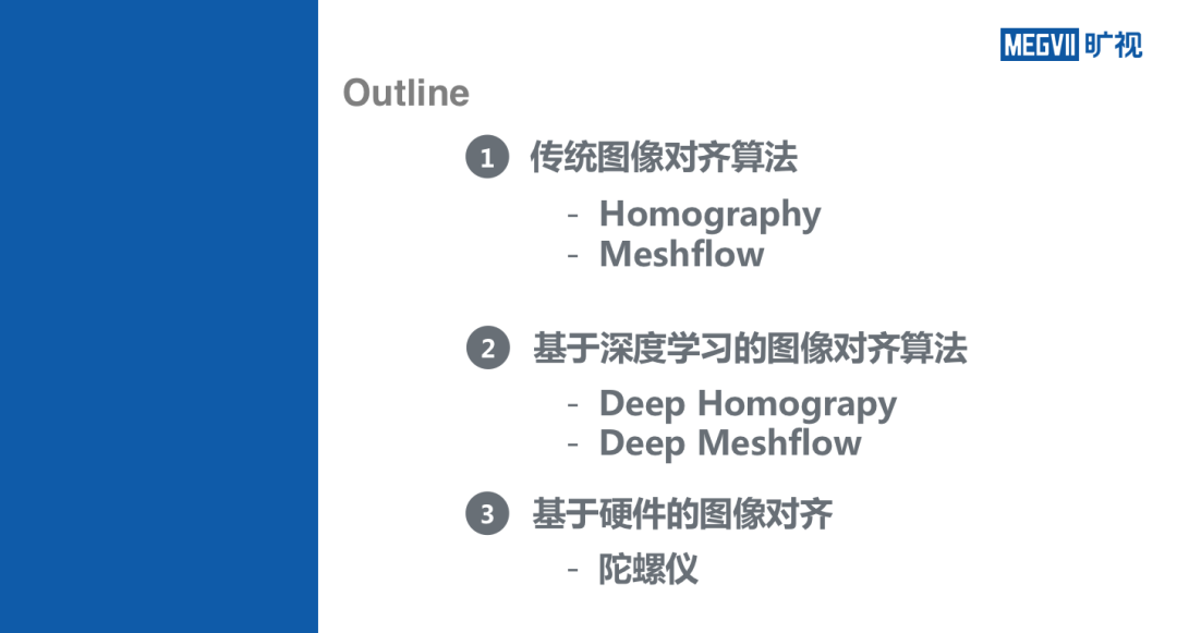 就图像对齐的传统方法而言,总体上可以分为三大类:Homography、Mesh Warps和Optical flow。本次TALK着重在前两者,Optical flow(光流)法不作展开。