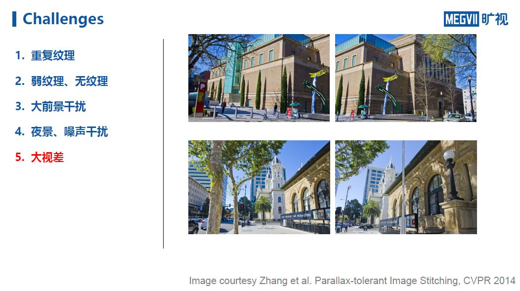 第五,大视差。 所谓大视差问题即由于拍摄角度发生了较大变化而对对齐模型造成的挑战。