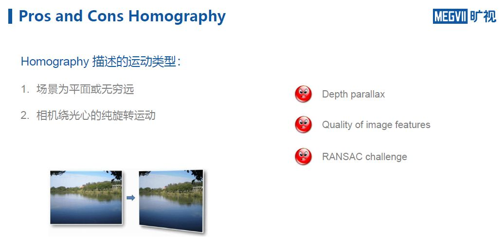 Homography的问题。 Homography有2个限定条件,即它描述的运动类型只能是平面或无穷远(视为平面)的运动、相机绕光心的纯旋转运动。这里总结了传统算法Homography会遭遇3个问题: