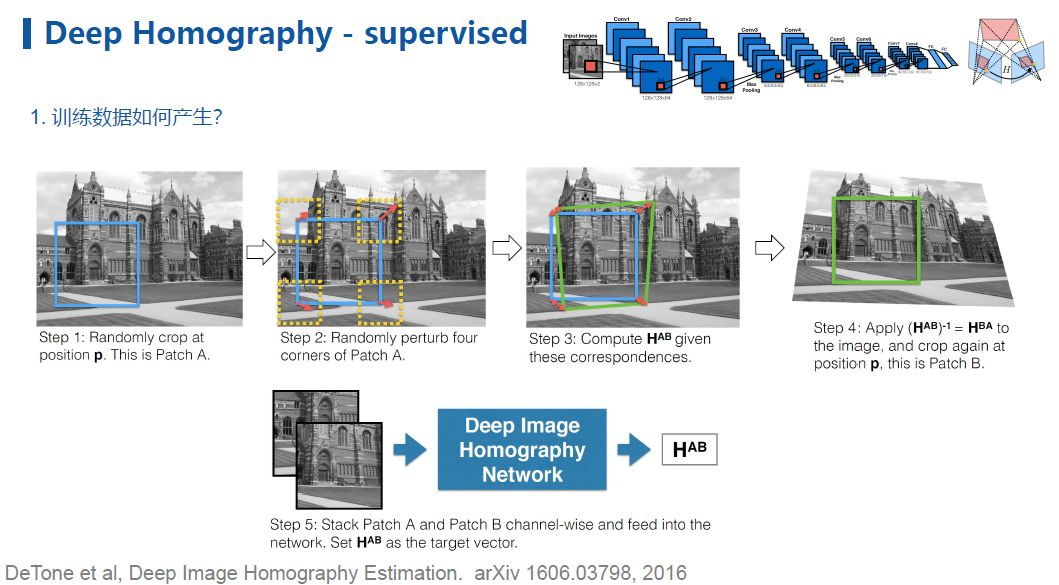 因为有4个点,所以可以解出homography。在第4步中,根据前述homography,我们对图像进行变形,然后再在位置P以同样的正方形选定画面,进行裁剪。由此得到原始图像裁剪部分与变换后同样位置图像的图像对。所以,对以这种方式生成的图像对进行训练就可以得到最终的模型。