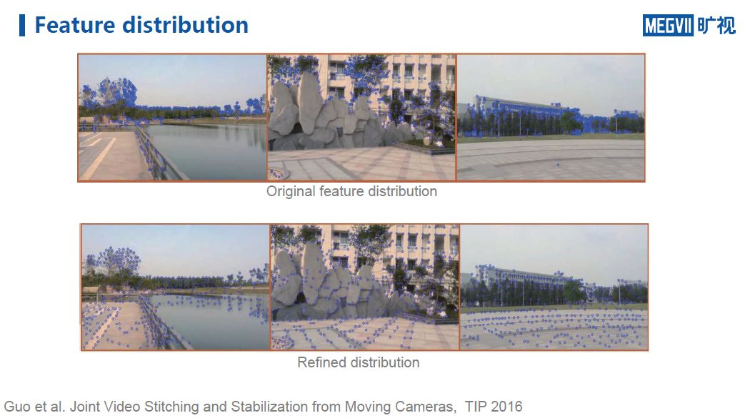 以下图为例,对于下图上方的图像,很有可能检测出来的特征点在全图中分布不均匀,因此一个较好的特征点分布应该是均匀全覆盖的。具体方法可以参考我们TIP 2016的论文。