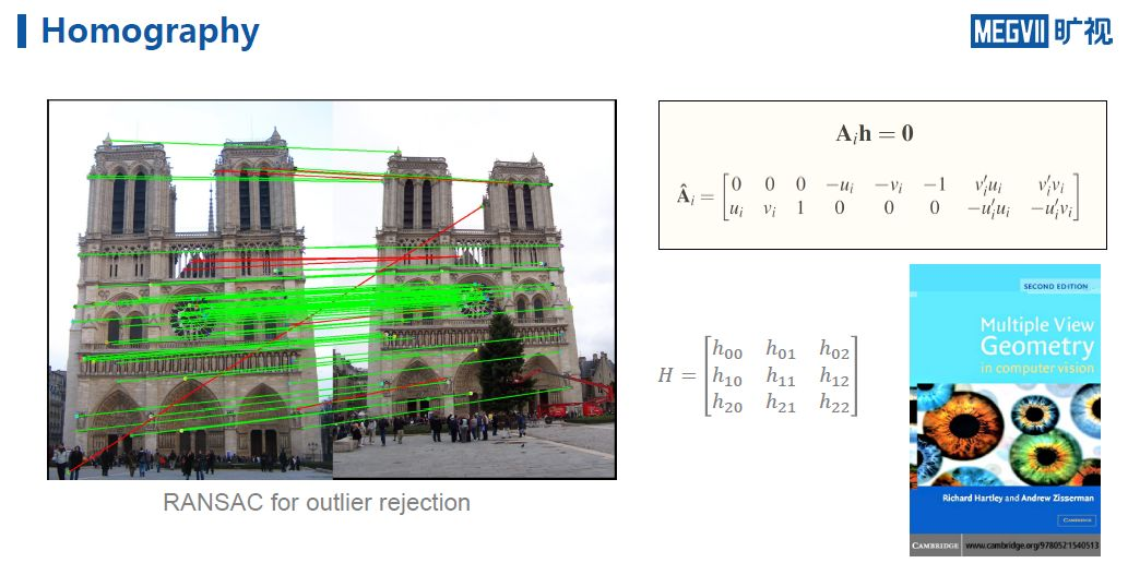 当特征点的匹配超过4个,那么就是解一个超定方程。如果大家对Homography感兴趣,具体内容可以参阅《Multiple View Geometry》这本书,介绍很详细。