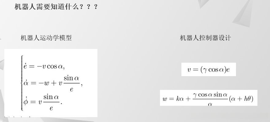 移动机器人现阶段有两个主要的任务: 第一个是轨迹跟踪,就是跟踪一个特定的并且实时变化的轨迹;第二个是镇定控制,即将机器人放置到初始位姿,然后利用设计的控制算法将其驱动到指定位姿处,也叫“泊车”或“刹车”。
