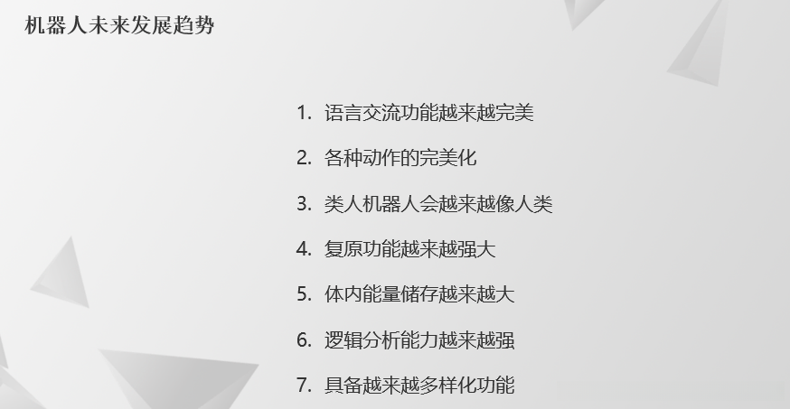 研制出外观和功能与人一样的类人机器人是现代科技发展的结果。全新组装的类人机器人全身布满了感应器,让它可以根据感应到的声音和动作做出适当反应,也让它对于光线和触觉的、反应更加灵敏。
